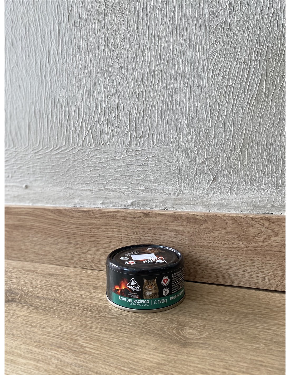 50% atún del Pacífico, 45% gelatina (agua, gelificante: carragenano), 4% bacalao, 1% arroz. Aditivo nutricional (por kg): Vitamina E (3a 700) 57,14 UI. Aditivo tecnológico (por kg): goma casia 2380mg.