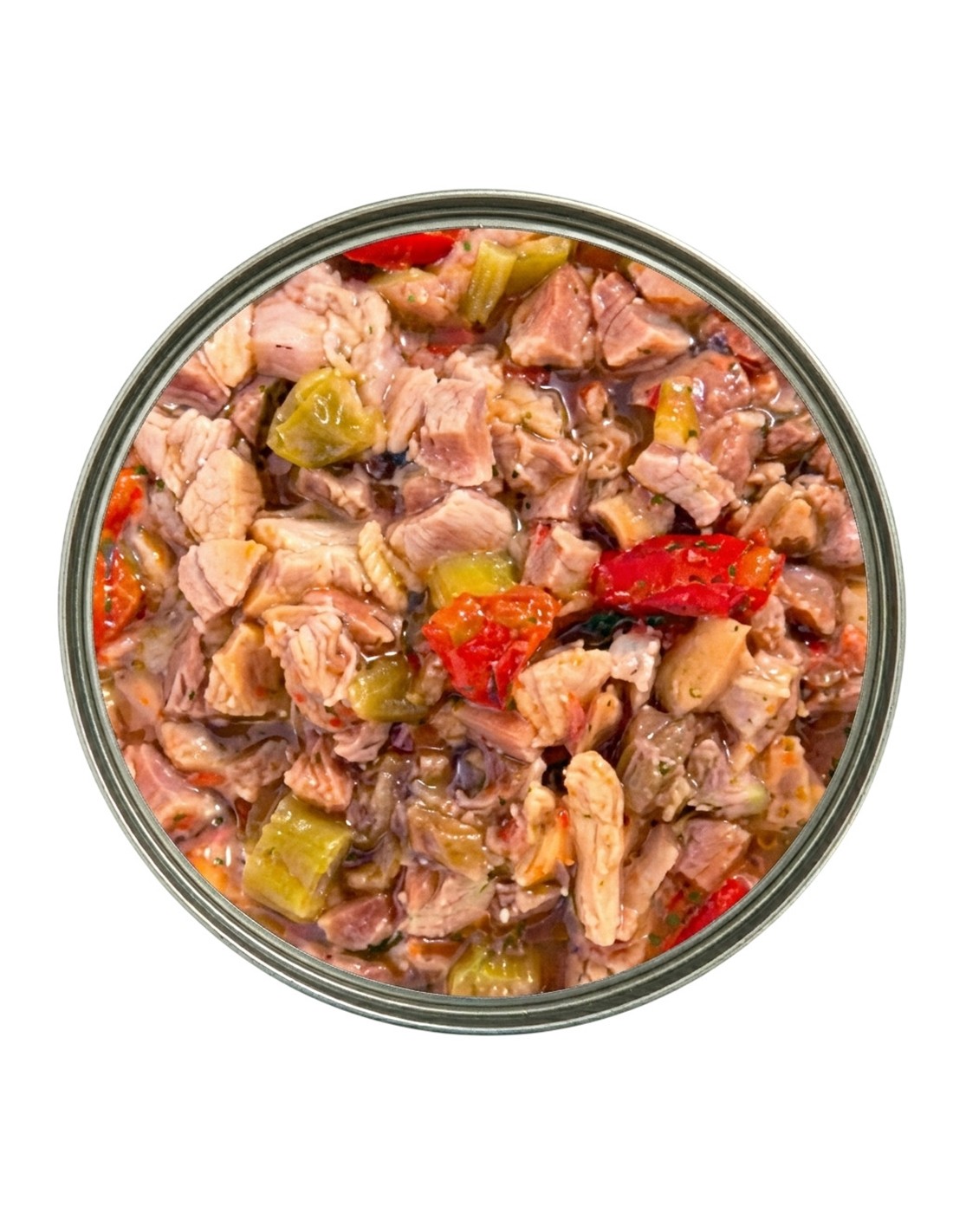 Composición: Carne y vísceras de pollo 65%, caldo 29%, pimiento 2%, judías verdes 2%, semillas de melón en polvo 1%, vitaminas y minerales 1%.