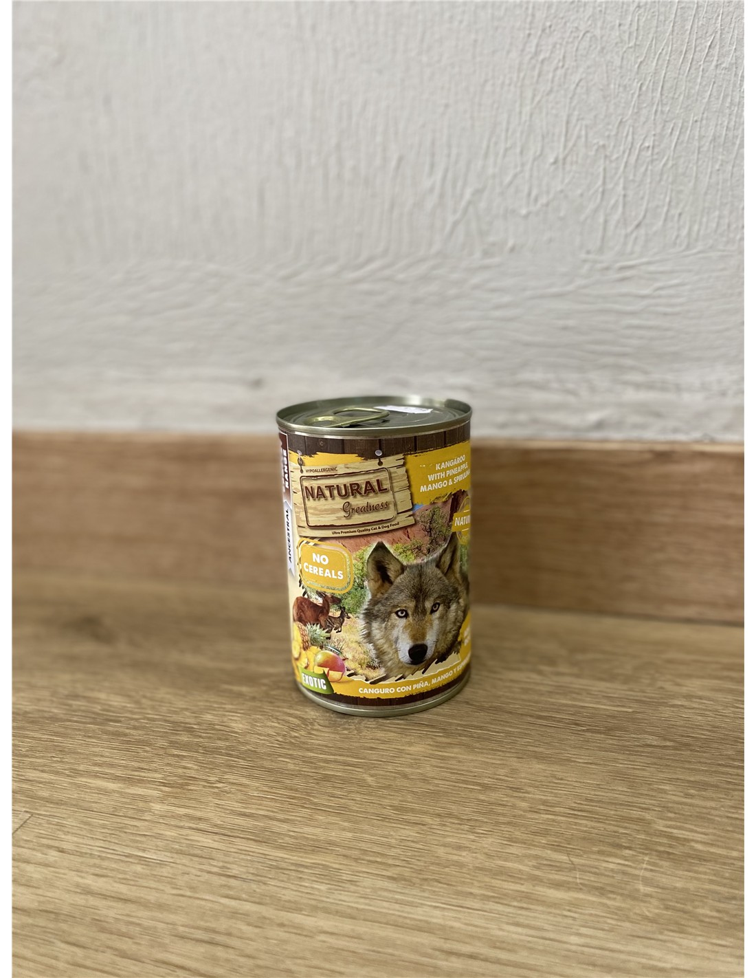 Canguro (65 %), Caldo (28,4 %), Piña (3 %), Mango (2 %), Minerales (1 %), Aceite de salmón (0,5 %) y Espirulina (0,1 %). Proteína bruta (11 %), Fibras (0,4 %), Grasa (5 %), Ceniza (2 %) y Humedad (80 %).