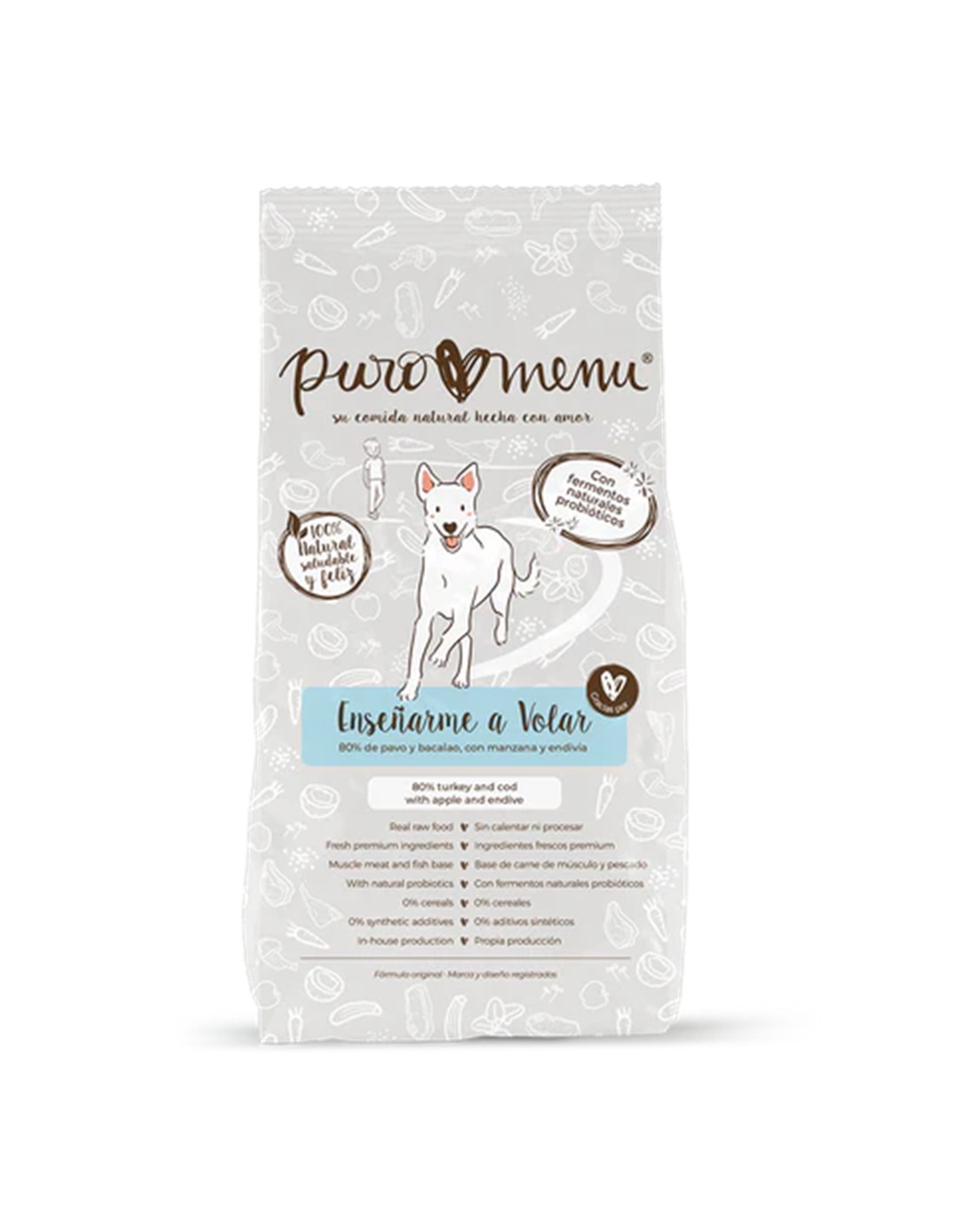 Bacalao 32%, carne de pavo con su piel 17.6%, carcasa de pavo 16%, corazón de pavo 7.2%, hígado de pavo 7.2%, zanahoria 5.6%, manzana 4.6%, endivia 3.2%, fermento de zanahoria 3%, semillas de girasol, albaricoque y ciruela amarilla, aceite de hígado de bacalao, germen de trigo sarraceno.
