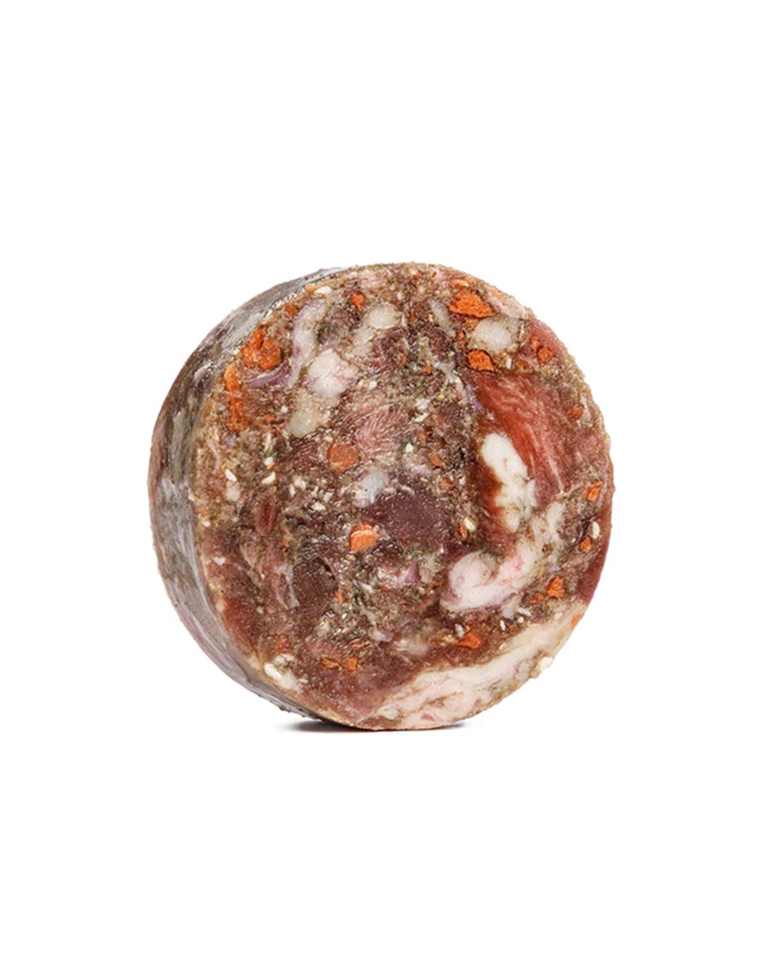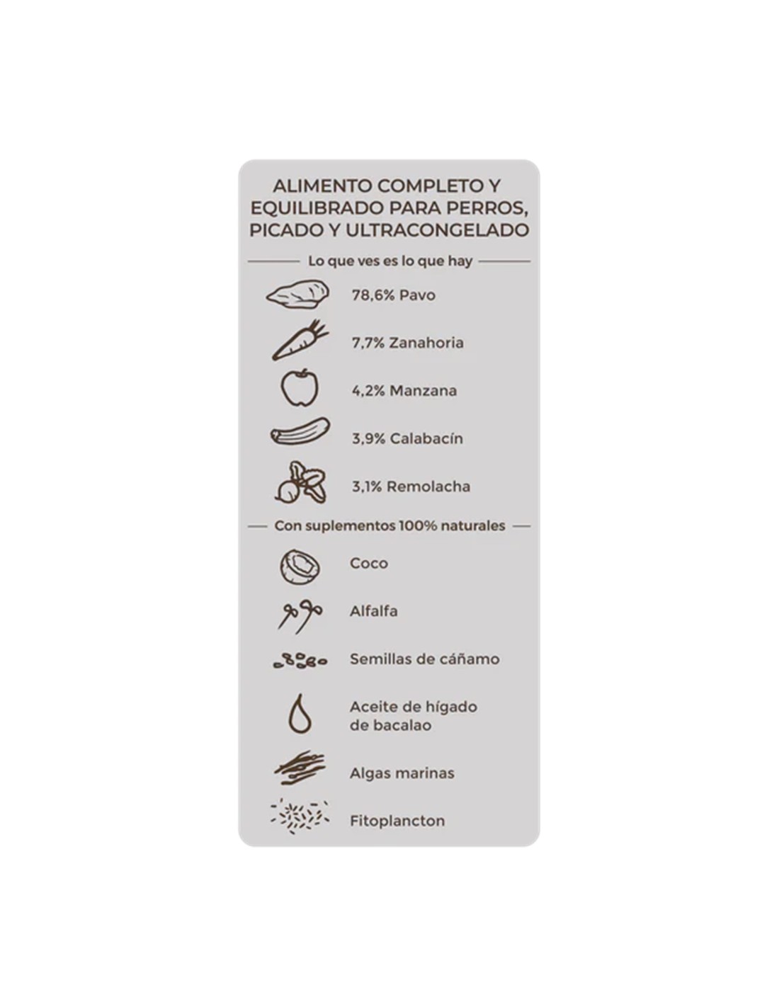 Comida completa y equilibrada para perros de cualquier raza. 100% natural, 0% cereales, 0% gluten, 0% aditivos sintéticos. 78% pavo y el ingrediente principal es la carne de músculo fresca de alta calidad. Ligero pavo, ideal para empezar con la dieta natural.