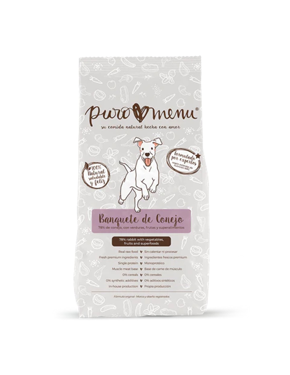 Comida completa y equilibrada para perros de cualquier raza. 78% de conejo, gran fuente de selenio, protector contra los radicales libres. De bajo valor calórico, para casos de alergia y/o intolerancias.
